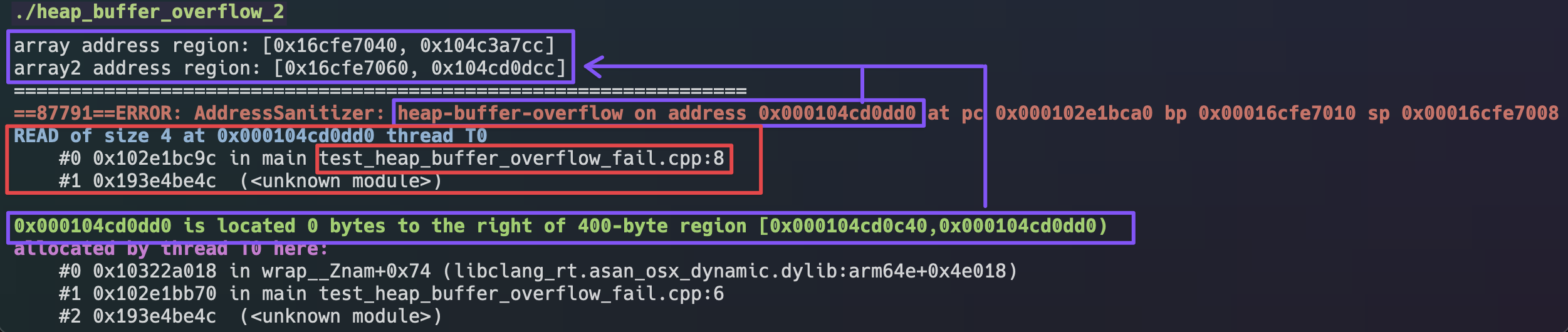 第一行告诉我们错误类型为 heap-buffer-overflow,访问出错的内存地址为 0x00010613a7d4, 我们先记下来。