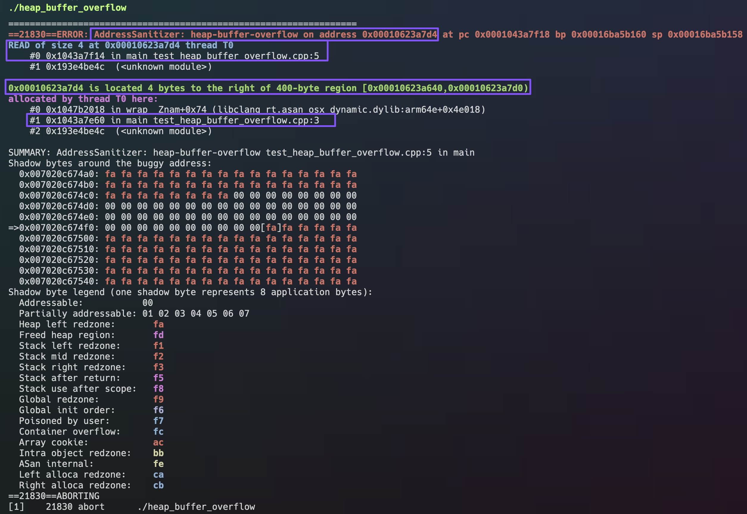 | 1 | clang -fsanitize=address -g -lc++ test_heap_buffer_overflow.cpp -o heap_buffer_overflow |