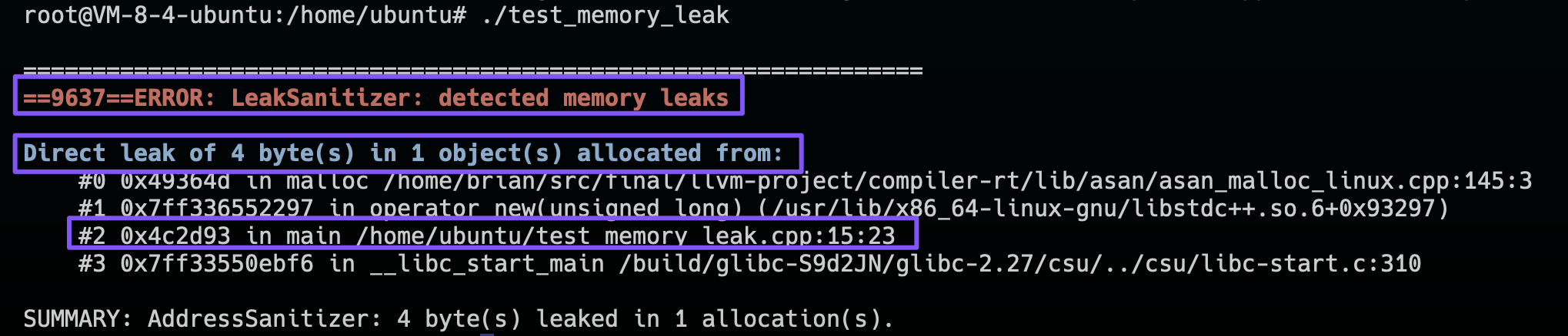 | 1 | clang -fsanitize=address -g -lstdc++ test_memory_leak.cpp -o test_memory_leak |