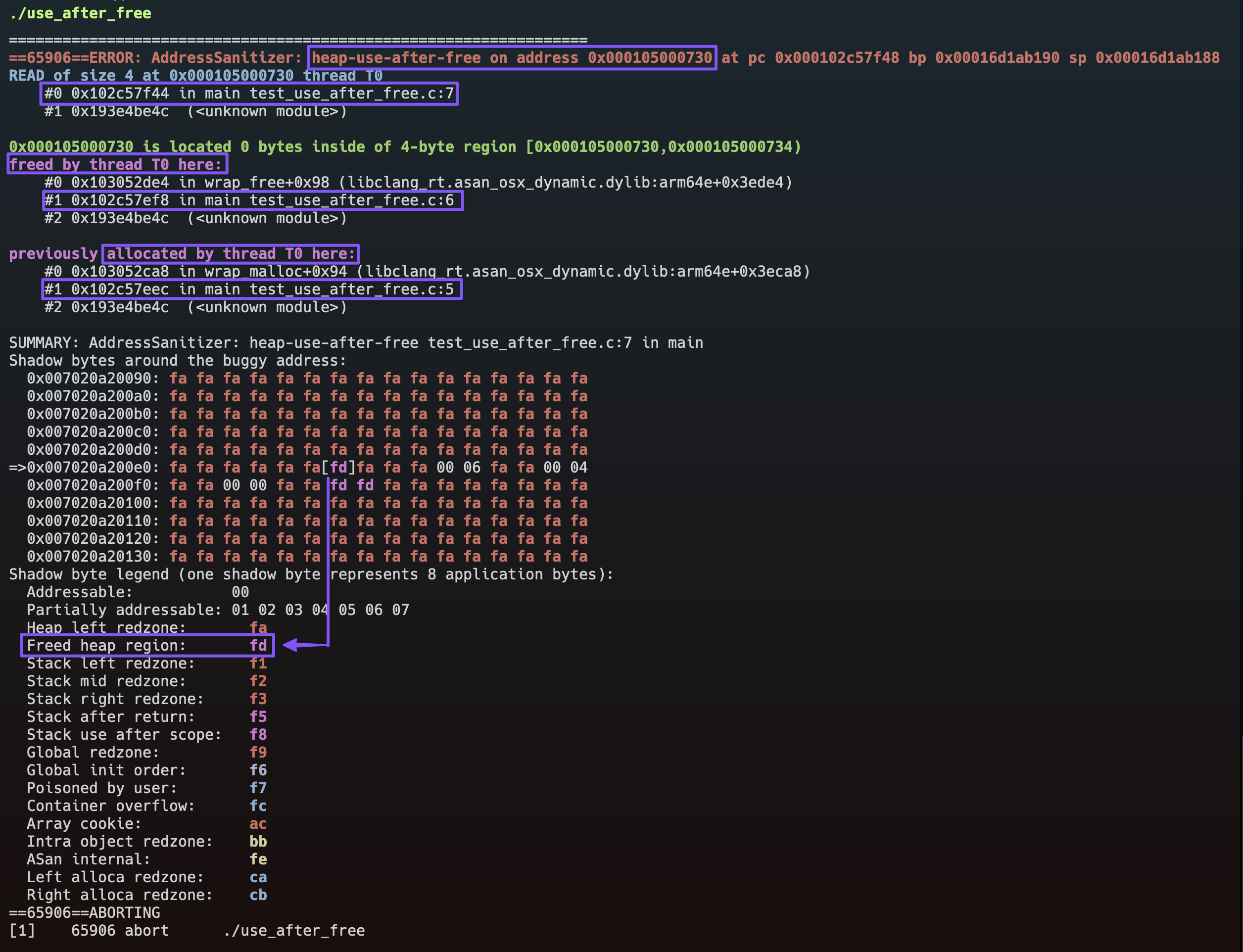 | 1 | clang -fsanitize=address -g test_use_after_free.c -o use_after_free |